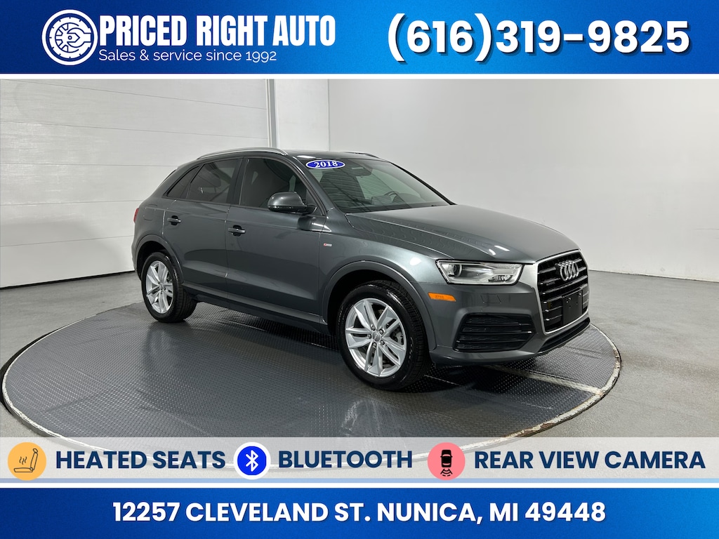 Priced Right Auto strives to provide our customers with a transparent & pressure free environment. The majority of our inventory is purchased from outside of the rust belt allowing us to offer only the cleanest possible vehicles that will look good for years to come (especially when combined with our available rust proofing package). Every vehicle gets a full 40 point safety inspection and any needed repairs are performed by our *ASE Certified Technicians in our full service center! Vehicles 10 years old & newer, with under 150k miles come with a FREE 3 Month 3,000 Mile POWERTRAIN WARRANTY *ON ELIGIBLE VEHICLES! **Cash or Finance** Let us put our financing sources to the test. We have over 20 lenders that help us offer a Guaranteed Credit Approval process! We offer full spectrum financing! Fill out your credit application in person or on our website and get approved today! Visit us at www.PRICEDRIGHTAUTO.org or call us today at 616-319-9825 to confirm vehicle availability and pricing. Come in and enjoy the Priced Right Auto difference! Check out all these great options 10 Speakers, 4-Wheel Disc Brakes, ABS brakes, Air Conditioning, Alloy wheels, AM/FM radio: SiriusXM, Audi Guard All-Weather Floor Mats w/Q3 Logo, Automatic temperature control, Axle Ratio: TBD, Black HomeLink, Brake assist, Bumpers: body-color, CD player, Delay-off headlights, Driver door bin, Driver vanity mirror, Dual front impact airbags, Dual front side impact airbags, Electronic Stability Control, Exterior Parking Camera Rear, Four wheel independent suspension, Front anti-roll bar, Front Bucket Seats, Front Center Armrest, Front dual zone A/C, Front fog lights, Front reading lights, Fully automatic headlights, Heated door mirrors, Heated front seats, High intensity discharge headlights: Xenon plus, Illuminated entry, Leather Seating Surfaces, Leather Shift Knob, Leather steering wheel, Low tire pressure warning, Occupant sensing airbag, Outside temperature display, Overhead airbag, Overhead console, Panic alarm, Passenger door bin, Passenger vanity mirror, Power door mirrors, Power driver seat, Power moonroof, Power passenger seat, Power steering, Power windows, Radio data system, Radio: Audi Concert System w/AM/FM Radio, Rain sensing wipers, Rear anti-roll bar, Rear fog lights, Rear reading lights, Rear seat center armrest, Rear window defroster, Rear window wiper, Remote keyless entry, Roof rack: rails only, Security system, Speed control, Speed-sensing steering, Split folding rear seat, Spoiler, Steering wheel mounted audio controls, Tachometer, Telescoping steering wheel, Tilt steering wheel, Traction control, Trip computer, Turn signal indicator mirrors, and Variably intermittent wiperS.