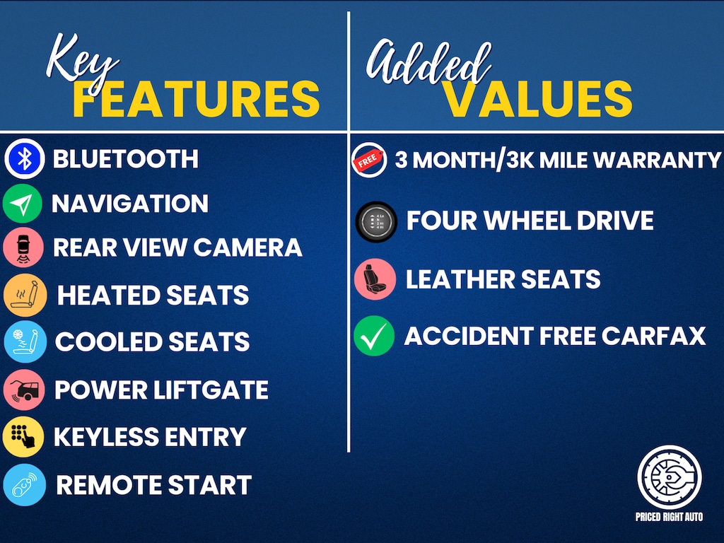 Priced Right Auto strives to provide our customers with a transparent & pressure free environment. The majority of our inventory is purchased from outside of the rust belt allowing us to offer only the cleanest possible vehicles that will look good for years to come (especially when combined with our available rust proofing package). Every vehicle gets a full 40 point safety inspection and any needed repairs are performed by our *ASE Certified Technicians in our full service center! Vehicles 10 years old & newer, with under 150k miles come with a FREE 3 Month 3,000 Mile POWERTRAIN WARRANTY *ON ELIGIBLE VEHICLES! **Cash or Finance** Let us put our financing sources to the test. We have over 20 lenders that help us offer a Guaranteed Credit Approval process! We offer full spectrum financing! Fill out your credit application in person or on our website and get approved today! Visit us at www.PRICEDRIGHTAUTO.org or call us today at 616-677-3866 to confirm vehicle availability and pricing. Come in and enjoy the Priced Right Auto difference! Check out all these great options Enhanced Driver Alert Package (Y86) (Automatic Emergency Braking, Forward Collision Alert, IntelliBeam Headlamps, and Lane Keep Assist w/Lane Departure Warning), License Plate Front Mounting Package, Magnetic Ride Control Suspension Package, Preferred Equipment Group 1LZ (1st & 2nd Row Color-Keyed Carpeted Floor Mats, 3rd Row 60/40 Power Fold Split-Bench, 4-Wheel Antilock Disc Brakes w/Brake Assist, 5 12-Volt Auxiliary Power Outlets, Auto-Dimming Inside Rear-View Mirror, Black Assist Steps w/Chrome Accent Strip, Bose Centerpoint Premium 10-Speaker Surround Sound, Cargo Net, Color-Keyed Carpeting Floor Covering, Driver Inboard & Front Passenger Airbags, Electronic Cruise Control w/Set & Resume Speed, Floor Console, Fog Lamps, Front & Rear Park Assist, Front Passenger 6-Way Power Seat Adjuster, Hands Free Power Liftgate, Heated & Ventilated Driver & Front Passenger Seats, Heated 2nd Row Outboard Seats, Heated Leather Wrapped Steering Wheel, Lane Change Alert w/Side Blind Zone Alert, Memory Settings, Passive Entry System, Power Release 2nd Row Bucket Seats, Power Tilt & Telescopic Steering Column, Power-Adjustable Accelerator & Brake Pedals, Power-Folding Heated Outside Mirrors, Push Button Keyless Start, Rear Cross Traffic Alert, Remote Keyless Entry, Remote Vehicle Start, Roof-Mounted Luggage Rack Side Rails, SiriusXM NavTraffic, SiriusXM Radio, Universal Home Remote, and Wireless Charging), 4WD, Black Leather, 10 Speakers, 3.08 Rear Axle Ratio, 3rd row seats: split-bench, 4-Wheel Disc Brakes, ABS brakes, Adaptive suspension, Adjustable pedals, Air Conditioning, Alloy wheels, AM/FM radio: SiriusXM, Apple CarPlay/Android Auto, Auto High-beam Headlights, Auto-dimming door mirrors, Auto-dimming Rear-View mirror, Auto-leveling suspension, Automatic temperature control, Black Roof Rack Cross Rails, Bluetooth for Phone, Bodyside moldings, Brake assist, Bumpers: body-color, CD player, Compass, Delay-off headlights, Driver door bin, Driver vanity mirror, Dual front impact airbags, Dual front side impact airbags, Electronic Stability Control, Emergency communication system: OnStar and Chevrolet connected services capable, Exterior Parking Camera Rear, Front anti-roll bar, Front Bucket Seats, Front Center Armrest, Front dual zone A/C, Front fog lights, Front Heated Reclining Bucket Seats, Front reading lights, Front wheel independent suspension, Fully automatic headlights, Garage door transmitter, HD Radio, Heated door mirrors, Heated front seats, Heated rear seats, Heated steering wheel, High-Intensity Discharge Headlights, Illuminated entry, Leather steering wheel, Low tire pressure warning, Memory seat, Navigation System, Occupant sensing airbag, Outside temperature display, Overhead airbag, Overhead console, Panic alarm, Passenger door bin, Passenger vanity mirror, Pedal memory, Perforated Leather-