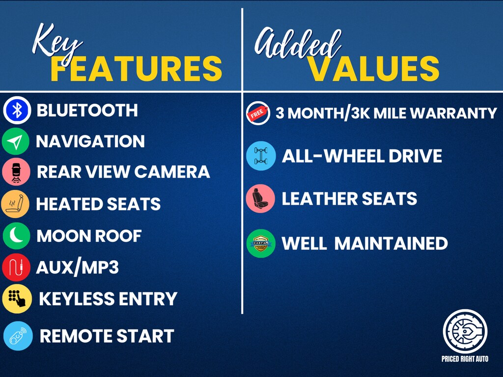 Priced Right Auto strives to provide our customers with a transparent & pressure free environment. The majority of our inventory is purchased from outside of the rust belt allowing us to offer only the cleanest possible vehicles that will look good for years to come (especially when combined with our available rust proofing package). Every vehicle gets a full 40 point safety inspection and any needed repairs are performed by our *ASE Certified Technicians in our full service center! Vehicles 10 years old & newer, with under 150k miles come with a FREE 3 Month 3,000 Mile POWERTRAIN WARRANTY *ON ELIGIBLE VEHICLES! **Cash or Finance** Let us put our financing sources to the test. We have over 20 lenders that help us offer a Guaranteed Credit Approval process! We offer full spectrum financing! Fill out your credit application in person or on our website and get approved today! Visit us at www.PRICEDRIGHTAUTO.org or call us today at 616-319-9825 to confirm vehicle availability and pricing. Come in and enjoy the Priced Right Auto difference! Check out all these great options Equipment Group 250A, 6-Speed Automatic, AWD, 12 Speakers, 4-Wheel Disc Brakes, ABS brakes, Air Conditioning, Alloy wheels, AM/FM radio: SiriusXM, Auto High-beam Headlights, Auto-dimming door mirrors, Auto-dimming Rear-View mirror, Automatic temperature control, Brake assist, Bumpers: body-color, CD player, Compass, Delay-off headlights, Driver door bin, Driver vanity mirror, Dual front impact airbags, Dual front side impact airbags, Electronic Stability Control, Emergency communication system: SYNC 3 911 Assist, Exterior Parking Camera Rear, Four wheel independent suspension, Front anti-roll bar, Front Bucket Seats, Front Center Armrest, Front dual zone A/C, Front fog lights, Front reading lights, Fully automatic headlights, Garage door transmitter, Heated door mirrors, Heated front seats, Heated steering wheel, Illuminated entry, Knee airbag, Leather Heated/Cooled Sport Bucket Seats, Low tire pressure warning, Memory seat, Navigation System, Occupant sensing airbag, Outside temperature display, Overhead airbag, Overhead console, Panic alarm, Passenger door bin, Passenger vanity mirror, Power door mirrors, Power driver seat, Power moonroof, Power passenger seat, Power steering, Power windows, Radio data system, Radio: Sony AM/FM Single-CD/MP3, Rain sensing wipers, Rear anti-roll bar, Rear reading lights, Rear seat center armrest, Rear window defroster, Remote keyless entry, Security system, SiriusXM Radio, Speed control, Speed-sensing steering, Speed-Sensitive Wipers, Split folding rear seat, Spoiler, Steering wheel mounted audio controls, SYNC 3 Communications & Entertainment System, Tachometer, Telescoping steering wheel, Tilt steering wheel, Traction control, Trip computer, Turn signal indicator mirrors, Variably intermittent wipers, Ventilated front seats, Voice-Activated Touchscreen Navigation System, and Wheels: 19" Machined-Face AluminuM.