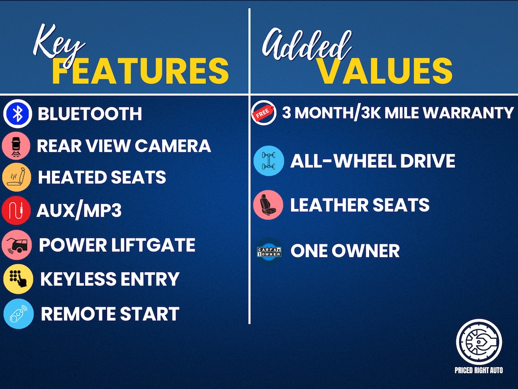 Priced Right Auto strives to provide our customers with a transparent & pressure free environment. The majority of our inventory is purchased from outside of the rust belt allowing us to offer only the cleanest possible vehicles that will look good for years to come (especially when combined with our available rust proofing package). Every vehicle gets a full 40 point safety inspection and any needed repairs are performed by our *ASE Certified Technicians in our full service center! Vehicles 10 years old & newer, with under 150k miles come with a FREE 3 Month 3,000 Mile POWERTRAIN WARRANTY *ON ELIGIBLE VEHICLES! **Cash or Finance** Let us put our financing sources to the test. We have over 20 lenders that help us offer a Guaranteed Credit Approval process! We offer full spectrum financing! Fill out your credit application in person or on our website and get approved today! Visit us at www.PRICEDRIGHTAUTO.org or call us today at 616-319-9825 to confirm vehicle availability and pricing. Come in and enjoy the Priced Right Auto difference! Check out all these great options Convenience Package (110V/150W AC Power Outlet, Fog Lamps w/Chrome Bezel, Perimeter Alarm, Power Liftgate, Remote Start System, SecuriCode Keyless Entry Keypad, Universal Garage Door Opener (UGDO), and Wireless Charging Pad), Equipment Group 201A, AWD, 3.80 Axle Ratio, 4-Wheel Disc Brakes, 6 Speakers, ABS brakes, ActiveX Seating Material Heated Bucket Seats, Air Conditioning, Alloy wheels, AM/FM radio: SiriusXM with 360L, Auto High-beam Headlights, Auto-dimming Rear-View mirror, Automatic temperature control, Brake assist, Bumpers: body-color, Compass, Delay-off headlights, Driver door bin, Driver vanity mirror, Dual front impact airbags, Dual front side impact airbags, Electronic Stability Control, Emergency communication system: SYNC 4 911 Assist, FordPass Connect, Four wheel independent suspension, Front & Rear Floor Liners w/Carpet Mats, Front anti-roll bar, Front Bucket Seats, Front Center Armrest w/Storage, Front dual zone A/C, Front reading lights, Fully automatic headlights, Heated door mirrors, Heated front seats, Heated Steering Wheel, Illuminated entry, Knee airbag, Low tire pressure warning, Occupant sensing airbag, Outside temperature display, Overhead airbag, Overhead console, Panic alarm, Passenger door bin, Passenger vanity mirror, Power door mirrors, Power driver seat, Power passenger seat, Power steering, Power windows, Radio: AM/FM Stereo/MP3 Capable, Rear anti-roll bar, Rear Parking Sensors, Rear reading lights, Rear seat center armrest, Rear window defroster, Rear window wiper, Remote keyless entry, Silver Roof-Rack Side Rails, SiriusXM w/360L, Speed control, Speed-Sensitive Wipers, Split folding rear seat, Spoiler, Steering wheel mounted audio controls, SYNC 4A w/Enhanced Voice Recognition, Tachometer, Telescoping steering wheel, Tilt steering wheel, Traction control, Trip computer, Variably intermittent wipers, and Wheels: 18" Sparkle Silver-Painted AluminuM.