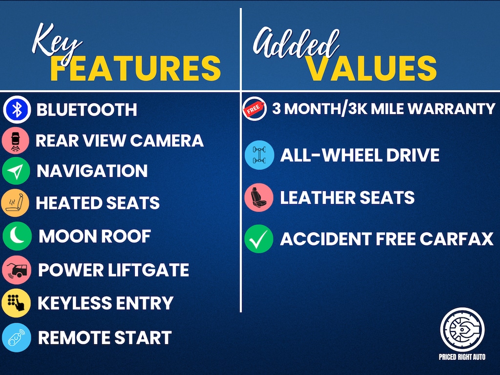 Priced Right Auto strives to provide our customers with a transparent & pressure free environment. The majority of our inventory is purchased from outside of the rust belt allowing us to offer only the cleanest possible vehicles that will look good for years to come (especially when combined with our available rust proofing package). Every vehicle gets a full 40 point safety inspection and any needed repairs are performed by our *ASE Certified Technicians in our full service center! Vehicles 10 years old & newer, with under 150k miles come with a FREE 3 Month 3,000 Mile POWERTRAIN WARRANTY *ON ELIGIBLE VEHICLES! **Cash or Finance** Let us put our financing sources to the test. We have over 20 lenders that help us offer a Guaranteed Credit Approval process! We offer full spectrum financing! Fill out your credit application in person or on our website and get approved today! Visit us at www.PRICEDRIGHTAUTO.org or call us today at 616-319-9825 to confirm vehicle availability and pricing. Come in and enjoy the Priced Right Auto difference! Check out all these great options AWD, 10 Speakers, 20" Alloy Wheels, 3rd row seats: split-bench, 4-Wheel Disc Brakes, 4.334 Axle Ratio, A/V remote, ABS brakes, Air Conditioning, Alloy wheels, AM/FM radio: SiriusXM, Apple CarPlay/Android Auto, Auto-dimming Rear-View mirror, Automatic temperature control, Brake assist, Bumpers: body-color, Compass, Delay-off headlights, Driver door bin, Driver vanity mirror, Dual front impact airbags, Dual front side impact airbags, Electronic Stability Control, Emergency communication system: HondaLink Assist, Exterior Parking Camera Rear, Four wheel independent suspension, Front anti-roll bar, Front Bucket Seats, Front Center Armrest, Front dual zone A/C, Front fog lights, Front reading lights, Fully automatic headlights, Garage door transmitter: HomeLink, Headphones, Heated door mirrors, Heated Front Bucket Seats, Heated front seats, Honda Satellite-Linked Navigation System, Illuminated entry, Leather Shift Knob, Leather-Trimmed Seats, Low tire pressure warning, Memory seat, Navigation System, Occupant sensing airbag, Outside temperature display, Overhead airbag, Overhead console, Panic alarm, Passenger door bin, Passenger vanity mirror, Power door mirrors, Power driver seat, Power Liftgate, Power moonroof, Power passenger seat, Power steering, Power windows, Radio data system, Radio: AM/FM Premium Audio System, Rear air conditioning, Rear anti-roll bar, Rear audio controls, Rear reading lights, Rear seat center armrest, Rear window defroster, Rear window wiper, Remote keyless entry, Roof rack: rails only, Security system, SiriusXM Radio, Speed control, Speed-sensing steering, Speed-Sensitive Wipers, Split folding rear seat, Spoiler, Steering wheel mounted audio controls, Tachometer, Telescoping steering wheel, Tilt steering wheel, Traction control, Trip computer, Turn signal indicator mirrors, and Variably intermittent wiperS.