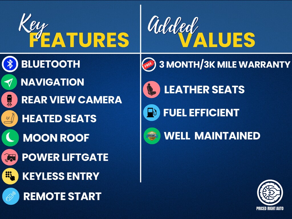 Priced Right Auto strives to provide our customers with a transparent & pressure free environment. The majority of our inventory is purchased from outside of the rust belt allowing us to offer only the cleanest possible vehicles that will look good for years to come (especially when combined with our available rust proofing package). Every vehicle gets a full 40 point safety inspection and any needed repairs are performed by our *ASE Certified Technicians in our full service center! Vehicles 10 years old & newer, with under 150k miles come with a FREE 3 Month 3,000 Mile POWERTRAIN WARRANTY *ON ELIGIBLE VEHICLES! **Cash or Finance** Let us put our financing sources to the test. We have over 20 lenders that help us offer a Guaranteed Credit Approval process! We offer full spectrum financing! Fill out your credit application in person or on our website and get approved today! Visit us at www.PRICEDRIGHTAUTO.org or call us today at 616-319-9825 to confirm vehicle availability and pricing. Come in and enjoy the Priced Right Auto difference! Check out all these great options 11 Speakers, 3.61 Axle Ratio, 3rd row seats: split-bench, 4-Wheel Disc Brakes, A/V remote, ABS brakes, Air Conditioning, Alloy wheels, AM/FM radio: SiriusXM, Anti-whiplash front head restraints, Apple CarPlay/Android Auto, Auto High-beam Headlights, Auto-dimming Rear-View mirror, Automatic temperature control, Blind Spot Information (BSI) System warning, Brake assist, Bumpers: body-color, CD player, Compass, Delay-off headlights, Driver door bin, Driver vanity mirror, Driver's Seat Mounted Armrest, Dual front impact airbags, Dual front side impact airbags, DVD-Audio, Electronic Stability Control, Emergency communication system: HondaLink, Exterior Parking Camera Rear, Four wheel independent suspension, Front anti-roll bar, Front Bucket Seats, Front dual zone A/C, Front fog lights, Front reading lights, Fully automatic headlights, Garage door transmitter: HomeLink, Headphones, Heated & Ventilated Front Bucket Seats, Heated door mirrors, Heated front seats, Heated steering wheel, Illuminated entry, Knee airbag, Leather Seat Trim, Leather steering wheel, Low tire pressure warning, Memory seat, Navigation system: Honda Satellite-Linked Navigation System, Occupant sensing airbag, Outside temperature display, Overhead airbag, Overhead console, Panic alarm, Passenger door bin, Passenger seat mounted armrest, Passenger vanity mirror, Power door mirrors, Power driver seat, Power Liftgate, Power moonroof, Power passenger seat, Power steering, Power windows, Radio data system, Radio: 550-Watt AM/FM/HD Premium Audio System, Rain sensing wipers, Rear air conditioning, Rear anti-roll bar, Rear audio controls, Rear reading lights, Rear seat center armrest, Rear window defroster, Rear window wiper, Reclining 3rd row seat, Remote keyless entry, Security system, Speed control, Speed-sensing steering, Speed-Sensitive Wipers, Split folding rear seat, Spoiler, Steering wheel mounted audio controls, Tachometer, Telescoping steering wheel, Tilt steering wheel, Traction control, Trip computer, Turn signal indicator mirrors, Variably intermittent wipe