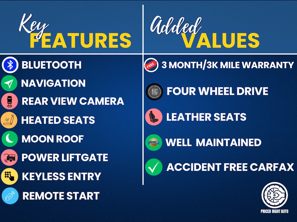 Priced Right Auto strives to provide our customers with a transparent & pressure free environment. The majority of our inventory is purchased from outside of the rust belt allowing us to offer only the cleanest possible vehicles that will look good for years to come (especially when combined with our available rust proofing package). Every vehicle gets a full 40 point safety inspection and any needed repairs are performed by our *ASE Certified Technicians in our full service center! Vehicles 10 years old & newer, with under 150k miles come with a FREE 3 Month 3,000 Mile POWERTRAIN WARRANTY *ON ELIGIBLE VEHICLES! **Cash or Finance** Let us put our financing sources to the test. We have over 20 lenders that help us offer a Guaranteed Credit Approval process! We offer full spectrum financing! Fill out your credit application in person or on our website and get approved today! Visit us at www.PRICEDRIGHTAUTO.org or call us today at 616-319-9825 to confirm vehicle availability and pricing. Come in and enjoy the Priced Right Auto difference! Check out all these great options High Altitude Package (Black Day Light Opening Moldings, Gloss Black Exterior Badging, Gloss Black Fascia Applique, Gloss Black Grille Surrounds, Gloss Black Roof Rails, and Wheels: 18" x 7" Gloss Black 5-Spoke Aluminum), Luxury Group (Exterior Mirrors w/Memory, Premium Leather Trimmed Bucket Seats, Radio/Driver Seat/Exterior Mirrors Memory, Tonneau Cover, and Ventilated Front Seats), Quick Order Package 27G, Technology Group (Adaptive Cruise Control w/Stop & Go, Advanced Brake Assist, Auto High Beam Headlamp Control, Exterior Mirrors Courtesy Lamps, Exterior Mirrors w/Supplemental Signals, Full Speed FWD Collision Warn Plus, Lane Departure Warning Plus, Parallel & Perp Park Assist w/Stop, and Rain Sensitive Windshield Wipers), Trailer Tow Group (7 & 4 Pin Wiring Harness, Auxiliary Transmission Oil Cooler, Class III Receiver Hitch, and Trailer Tow Wiring Harness), 1 Year Trial (Registration Required), 4-Wheel Disc Brakes, 5-Year SiriusXM Traffic Service, 5-Year SiriusXM Travel Link Service, 6 Speakers, 600 Amp Maintenance Free Battery, 8.4" Touchscreen Display, 9 Amplified Speakers w/Subwoofer, ABS brakes, Active Grille Shutters, Air Conditioning, Alloy wheels, AM/FM radio: SiriusXM, Anti-whiplash front head restraints, Auto-dimming Rear-View mirror, Automatic temperature control, Brake assist, Bumpers: body-color, Compass, Delay-off headlights, Driver door bin, Driver vanity mirror, Dual front impact airbags, Dual front side impact airbags, Electronic Range Select, Electronic Stability Control, Emergency communication system: Uconnect Access, Engine Oil Cooler, Four wheel independent suspension, Front anti-roll bar, Front Bucket Seats, Front Center Armrest, Front dual zone A/C, Front fog lights, Front License Plate Bracket, Front reading lights, Fully automatic headlights, Garage door transmitter, GPS Antenna Input, GPS Navigation, HD Radio, Heated door mirrors, Heated front seats, Heated steering wheel, High intensity discharge headlights: Bi-Xenon, Illuminated entry, Integrated Voice Command w/Bluetooth, Knee airbag, Leather Shift Knob, Leather Trimmed Bucket Seats, Low tire pressure warning, Normal Duty Suspension, Occupant sensing airbag, Off Road Suspension, Outside temperature display, Overhead airbag, Overhead console, Panic alarm, ParkView Rear Back-Up Camera, Passenger door bin, Passenger vanity mirror, Power door mirrors, Power driver seat, Power Front/Fixed Rear Full Sunroof, Power Liftgate, Power steering, Power windows, Radio data system, Radio: Uconnect 3C Nav w/8.4" Display, Radio: Uconnect 3C w/8.4" Display, Rear anti-roll bar, Rear reading lights, Rear seat center armrest, Rear side impact airbag, Rear window defroster, Re