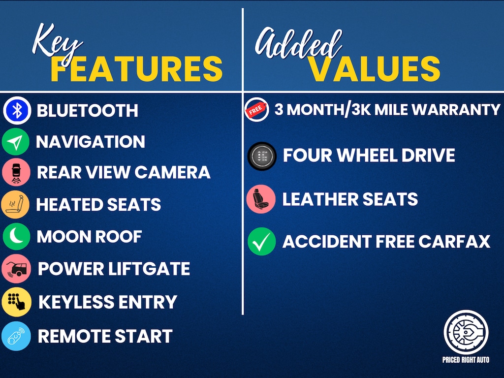 Priced Right Auto strives to provide our customers with a transparent & pressure free environment. The majority of our inventory is purchased from outside of the rust belt allowing us to offer only the cleanest possible vehicles that will look good for years to come (especially when combined with our available rust proofing package). Every vehicle gets a full 40 point safety inspection and any needed repairs are performed by our *ASE Certified Technicians in our full service center! Vehicles 10 years old & newer, with under 150k miles come with a FREE 3 Month 3,000 Mile POWERTRAIN WARRANTY *ON ELIGIBLE VEHICLES! **Cash or Finance** Let us put our financing sources to the test. We have over 20 lenders that help us offer a Guaranteed Credit Approval process! We offer full spectrum financing! Fill out your credit application in person or on our website and get approved today! Visit us at www.PRICEDRIGHTAUTO.org or call us today at 616-319-9825 to confirm vehicle availability and pricing. Come in and enjoy the Priced Right Auto difference! Check out all these great options Quick Order Package 2BH, 4WD, 1-Year SiriusXM Guardian Trial, 3.45 Rear Axle Ratio, 4-Wheel Disc Brakes, 4G LTE Wi-Fi Hot Spot, 6 Speakers, 8.4" Touchscreen Display, ABS brakes, Air Conditioning, Alloy wheels, AM/FM radio: SiriusXM, Anti-whiplash front head restraints, Apple CarPlay, Apple CarPlay/Android Auto, Audio memory, Auto-dimming door mirrors, Auto-dimming Rear-View mirror, Automatic temperature control, Brake assist, Bumpers: body-color, Compass, Delay-off headlights, Driver door bin, Driver vanity mirror, Dual front impact airbags, Dual front side impact airbags, Electronic Stability Control, Emergency communication system: SiriusXM Guardian, Engine Oil Cooler, Four wheel independent suspension, Front anti-roll bar, Front Bucket Seats, Front Center Armrest w/Storage, Front dual zone A/C, Front fog lights, Front License Plate Bracket, Front reading lights, Fully automatic headlights, Garage door transmitter, Google Android Auto, GPS Antenna Input, GPS Navigation, HD Radio, Heated door mirrors, Heated front seats, Heated steering wheel, Illuminated entry, Integrated Center Stack Radio, Integrated Voice Command w/Bluetooth, Knee airbag, Leather Shift Knob, Leather Trimmed Bucket Seats, Low tire pressure warning, Memory seat, Navigation System, Normal Duty Suspension, Occupant sensing airbag, Outside temperature display, Overhead airbag, Overhead console, Panic alarm, ParkView Rear Back-Up Camera, Passenger door bin, Passenger vanity mirror, Power door mirrors, Power driver seat, Power Liftgate, Power moonroof, Power passenger seat, Power steering, Power windows, Quadra-Trac II 4WD System, Radio data system, Radio: Uconnect 4C Nav w/8.4" Display, Rear anti-roll bar, Rear reading lights, Rear seat center armrest, Rear window defroster, Rear window wiper, Remote keyless entry, Security system, Selec-Terrain System, SiriusXM Satellite Radio, SiriusXM Traffic Plus, SiriusXM Travel Link, Speed control, Speed-sensing steering, Speed-Sensitive Wipers, Split folding rear seat, Spoiler, Steering wheel mounted audio controls, Tachometer, Telescoping steering wheel, Tilt steering wheel, Traction control, Trip computer, Turn signal indicator mirrors, USB Host Flip, Variably intermittent wipers, Voltmeter, Wheels: 18" x 8.0" Tech Gray Aluminum (DISC), and Wheels: 18" x 8.0" Tech Gray Diamond CuT.