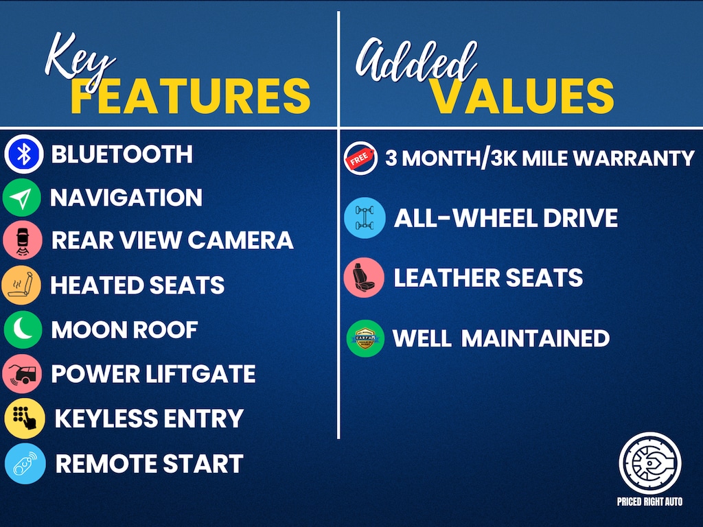 Priced Right Auto strives to provide our customers with a transparent & pressure free environment. The majority of our inventory is purchased from outside of the rust belt allowing us to offer only the cleanest possible vehicles that will look good for years to come (especially when combined with our available rust proofing package). Every vehicle gets a full 40 point safety inspection and any needed repairs are performed by our *ASE Certified Technicians in our full service center! Vehicles 10 years old & newer, with under 150k miles come with a FREE 3 Month 3,000 Mile POWERTRAIN WARRANTY *ON ELIGIBLE VEHICLES! **Cash or Finance** Let us put our financing sources to the test. We have over 20 lenders that help us offer a Guaranteed Credit Approval process! We offer full spectrum financing! Fill out your credit application in person or on our website and get approved today! Visit us at www.PRICEDRIGHTAUTO.org or call us today at 616-319-9825 to confirm vehicle availability and pricing. Come in and enjoy the Priced Right Auto difference! Check out all these great options Equipment Group 201A, AWD, 1-Touch PowerFold & Tumble 3rd Row Fold Flat Bench, 14 Speakers, 19" Painted Aluminum Wheels, 3rd row seats: split-bench, 4-Wheel Disc Brakes, ABS brakes, Adaptive suspension, Adjustable pedals, Air Conditioning, Alloy wheels, AM/FM radio: SiriusXM, AppLink/Apple CarPlay and Android Auto, Auto High-beam Headlights, Auto tilt-away steering wheel, Auto-dimming door mirrors, Auto-dimming Rear-View mirror, Automatic temperature control, Axle Ratio: 3.16, BLIS Blind Spot Information System, Brake assist, Bumpers: body-color, CD player, Compass, Delay-off headlights, Driver door bin, Driver vanity mirror, Dual front impact airbags, Dual front side impact airbags, Electronic Stability Control, Emergency communication system: 911 Assist, Exterior Parking Camera Rear, Four wheel independent suspension, Front anti-roll bar, Front Bucket Seats, Front Center Armrest, Front dual zone A/C, Front fog lights, Front reading lights, Fully automatic headlights, Garage door transmitter, HD Radio, Heated door mirrors, Heated front seats, Heated rear seats, Heated Steering Wheel, Heated steering wheel, High-Intensity Discharge Headlights, Illuminated entry, Leather steering wheel, Low tire pressure warning, Memory seat, Navigation System, Occupant sensing airbag, Outside temperature display, Overhead airbag, Overhead console, Panic alarm, Passenger door bin, Passenger vanity mirror, Pedal memory, Power door mirrors, Power driver seat, Power Liftgate, Power passenger seat, Power steering, Power windows, Premium Perforated Leather Front Bucket Seats, Radio data system, Radio: AM/FM In-Dash Single-CD/MP3-Capable, Rain sensing wipers, Rear air conditioning, Rear anti-roll bar, Rear reading lights, Rear seat center armrest, Rear window defroster, Rear window wiper, Remote keyless entry, Security system, Speed control, Speed-sensing steering, Speed-Sensitive Wipers, Split folding rear seat, Spoiler, Steering wheel memory, Steering wheel mounted audio controls, SYNC 3 Communications & Entertainment System, Tachometer, Telescoping steering wheel, THX II Audio System, Tilt steering wheel, Traction control, Trip computer, Turn signal indicator mirrors, Variably intermittent wipers, and Ventilated front seatS.