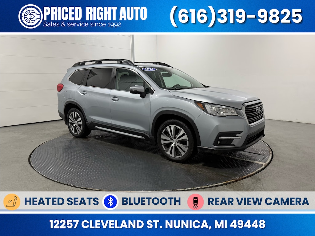 Priced Right Auto strives to provide our customers with a transparent & pressure free environment. The majority of our inventory is purchased from outside of the rust belt allowing us to offer only the cleanest possible vehicles that will look good for years to come (especially when combined with our available rust proofing package). Every vehicle gets a full 40 point safety inspection and any needed repairs are performed by our *ASE Certified Technicians in our full service center! Vehicles 10 years old & newer, with under 150k miles come with a FREE 3 Month 3,000 Mile POWERTRAIN WARRANTY *ON ELIGIBLE VEHICLES! **Cash or Finance** Let us put our financing sources to the test. We have over 20 lenders that help us offer a Guaranteed Credit Approval process! We offer full spectrum financing! Fill out your credit application in person or on our website and get approved today! Visit us at www.PRICEDRIGHTAUTO.org or call us today at 616-319-9825 to confirm vehicle availability and pricing. Come in and enjoy the Priced Right Auto difference! Check out all these great options Popular Package #2A (All-Weather Floor Liners, Auto-Dimming Exterior Mirror w/Approach Light, Cargo Tray, Map & Reading Lights LED Upgrade - 6 Bulb Kit, Rear Bumper Cover, and Splash Guards), Standard Model, 3rd Row Bench Rear Seatback Protector, 3rd row seats: bench, 4-Wheel Disc Brakes, 6 Speakers, ABS brakes, Air Conditioning, Alloy wheels, AM/FM radio: SiriusXM, Auto High-beam Headlights, Auto-dimming Rear-View mirror, Automatic temperature control, Axle Ratio: 4.44, Brake assist, Bumpers: body-color, CD player, Compass, Cup Holder Insert, Delay-off headlights, Driver door bin, Driver vanity mirror, Dual front impact airbags, Dual front side impact airbags, Electronic Stability Control, Emergency communication system: STARLINK Safety and Security (Subscription Required), Exterior Parking Camera Rear, Four wheel independent suspension, Front anti-roll bar, Front Bucket Seats, Front Center Armrest, Front dual zone A/C, Front fog lights, Front reading lights, Fully automatic headlights, Garage door transmitter: HomeLink, Heated door mirrors, Heated Front Bucket Seats, Heated front seats, Heated rear seats, Heated steering wheel, Illuminated entry, Knee airbag, Low tire pressure warning, Memory seat, Occupant sensing airbag, Outside temperature display, Overhead airbag, Overhead console, Panic alarm, Passenger door bin, Passenger vanity mirror, Perforated Leather-Trimmed Upholstery, Power door mirrors, Power driver seat, Power Liftgate, Power passenger seat, Power steering, Power windows, Radio data system, Radio: Subaru STARLINK 8.0" Multimedia Plus System, Rear air conditioning, Rear anti-roll bar, Rear reading lights, Rear seat center armrest, Rear window defroster, Rear window wiper, Reclining 3rd row seat, Remote keyless entry, Security system, Speed control, Split folding rear seat, Spoiler, STARLINK/Apple CarPlay/Android Auto, Steering wheel mounted audio controls, Tachometer, Telescoping steering wheel, Tilt steering wheel, Traction control, Trip computer, Turn signal indicator mirrors, Variably intermittent wipers, and Wheels: 20" x 7.5 J Dk Gray Alloy w/Machine FinisH.