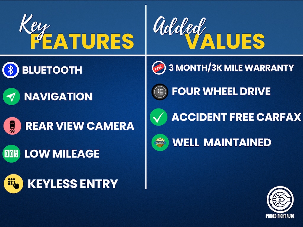 Priced Right Auto strives to provide our customers with a transparent & pressure free environment. The majority of our inventory is purchased from outside of the rust belt allowing us to offer only the cleanest possible vehicles that will look good for years to come (especially when combined with our available rust proofing package). Every vehicle gets a full 40 point safety inspection and any needed repairs are performed by our *ASE Certified Technicians in our full service center! Vehicles 10 years old & newer, with under 150k miles come with a FREE 3 Month 3,000 Mile POWERTRAIN WARRANTY *ON ELIGIBLE VEHICLES! **Cash or Finance** Let us put our financing sources to the test. We have over 20 lenders that help us offer a Guaranteed Credit Approval process! We offer full spectrum financing! Fill out your credit application in person or on our website and get approved today! Visit us at www.PRICEDRIGHTAUTO.org or call us today at 616-319-9825 to confirm vehicle availability and pricing. Come in and enjoy the Priced Right Auto difference! Check out all these great options 4WD, Graphite Cloth, 17" x 7.0" 6-Spoke Alloy Wheels, 3.727 Axle Ratio, 4-Wheel Disc Brakes, 8 Speakers, ABS brakes, Air Conditioning, Alloy wheels, AM/FM radio: SiriusXM, Anti-whiplash front head restraints, Apple CarPlay/Android Auto, Auto High-beam Headlights, Brake assist, Bumpers: body-color, Driver door bin, Driver vanity mirror, Dual front impact airbags, Dual front side impact airbags, Electronic Stability Control, Emergency communication system: Safety Connect with 1-year trial, Exterior Parking Camera Rear, Front anti-roll bar, Front Bucket Seats, Front Center Armrest, Front fog lights, Front reading lights, Front wheel independent suspension, Heated door mirrors, Illuminated entry, Knee airbag, Leather Shift Knob, Leather steering wheel, Low Fabric Seat Trim, Low tire pressure warning, Occupant sensing airbag, Outside temperature display, Overhead airbag, Overhead console, Panic alarm, Passenger door bin, Passenger vanity mirror, Power door mirrors, Power driver seat, Power steering, Power windows, Radio: Audio, Radio: Premium Audio w/Dynamic Navigation, Rear anti-roll bar, Rear seat center armrest, Rear window defroster, Rear window wiper, Remote keyless entry, Roof rack: rails only, Security system, Speed control, Speed-sensing steering, Split folding rear seat, Spoiler, Steering wheel mounted audio controls, Tachometer, Telescoping steering wheel, Tilt steering wheel, Traction control, Trip computer, and Variably intermittent wiperS.